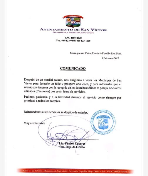 Después de un cordial saludo, nos dirigimos a todos los Munícipes de San Víctor para desearle un feliz y próspero año 2025, y para informales que el retraso que tenemos con la recogida de los desechos sólidos es porque de cuatros unidades (Camiones) dos están fuera de servicios.