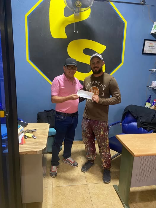 El encargado de cultura del ayuntamiento de San Víctor Pedro Sanchez, hace entrega del cheque del mes al artista plástico Alberto Caraballo, como aporte para la realización del mural que este realizó en el parque municipal La Altagracia , destacando el arte y la gran diversidad agropecuaria que se produce en nuestro municipio.