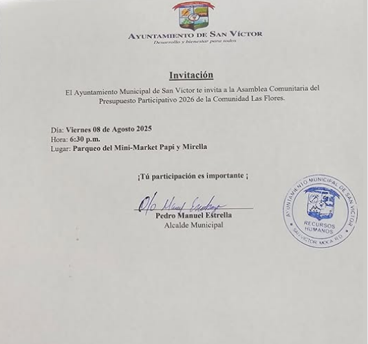 Invitación a la Primera Asamblea Comunitaria del Presupuesto Participativo 2026, en el Sector de Las Flores, Ceiba de Madera San Víctor, San Víctor.