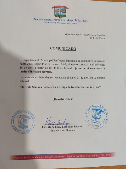 Por disposición del Gobierno de la República la alcaldía trabaja hasta este miércoles, nos reintegramos a las labores del 21 debido al asueto de Semana Santa.