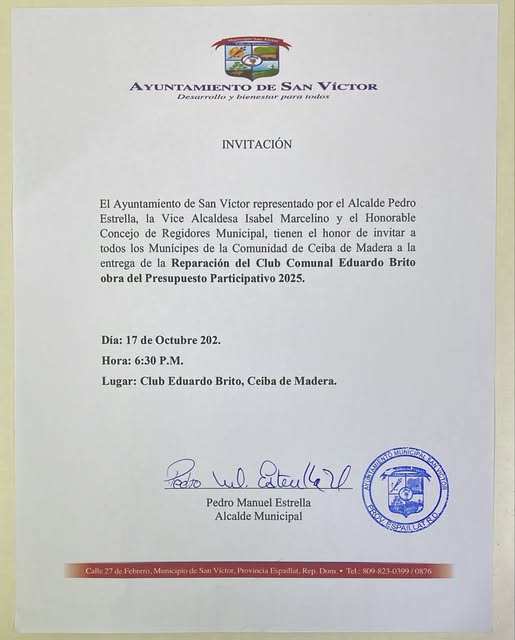 17 Octubre – El alcalde Pedro Manuel Estrella Ureña siegue sus trabajos en Ceiba De Madera y este viernes 17 entrega el Club Eduardo Brito totalmente #Remozado.