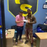 El encargado de cultura del ayuntamiento de San Víctor Pedro Sanchez, hace entrega del cheque del mes al artista plástico...