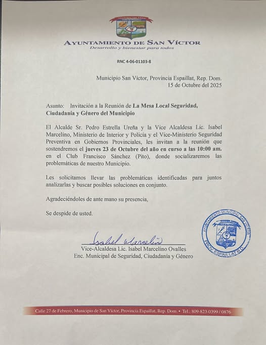 Invitación a la Mesa Local Seguridad Ciudadanía Y Género del Municipio, este jueves 23 en el Club Francisco Sánchez ( Pito) A las 10:00 AM