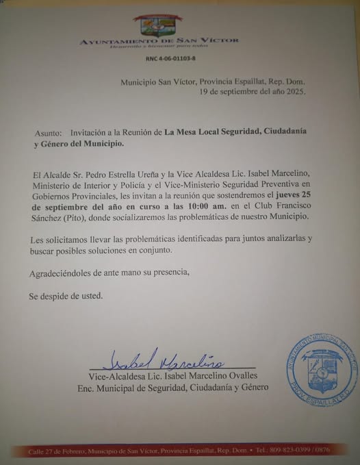 23 Septiembre – #Invitación a la Mesa Local Seguridad, Ciudadanía Y Género Del Municipio San Víctor, este jueves 25 de septiembreva a las 10:00 AM en el Club Francisco Sánchez (Pito)