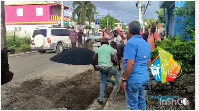 Alcalde Pedro Estrella realiza bacheo en la calle 27 de febrero con fondos del ayuntamiento en vista del franco deterioro que presenta esta vía que es la principal del municipio.